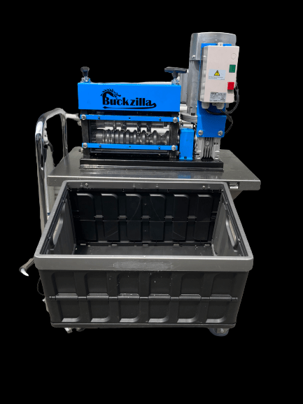 This bucking machine is powerful, durable, and very easy to use. The gears spin at 75 feet/min, which is the optimal speed for bucking dry plants.